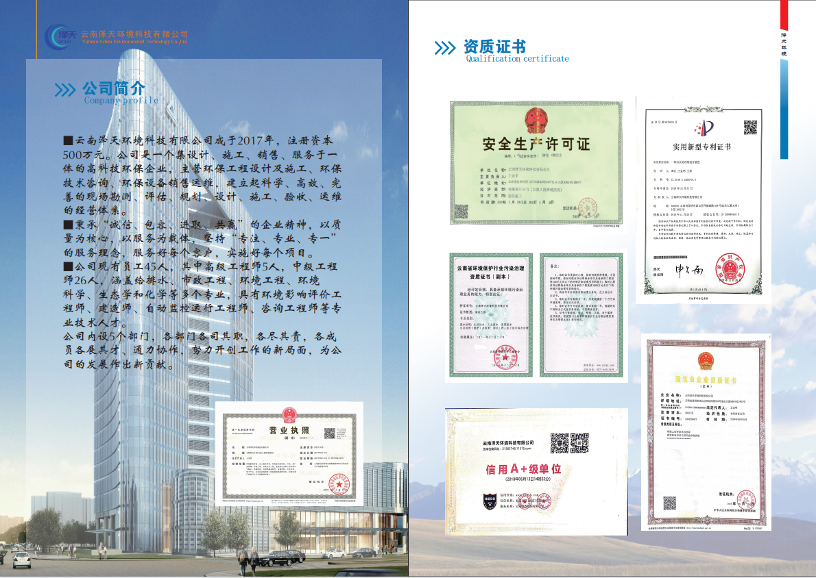 云南澤天環(huán)境科技有限公司成立于2017年,注冊資本500萬元。公司是一個(gè)集設(shè)計(jì)、施工、銷售、服務(wù)于一體的高科技環(huán)保企業(yè),主營環(huán)保工程設(shè)計(jì)及施工、環(huán)保技術(shù)咨詢、環(huán)保設(shè)備銷售運(yùn)維,建立起科學(xué)、高效、完善的現(xiàn)場勘測、評估、規(guī)劃、設(shè)計(jì)、施工、驗(yàn)收、運(yùn)維的經(jīng)營體系。