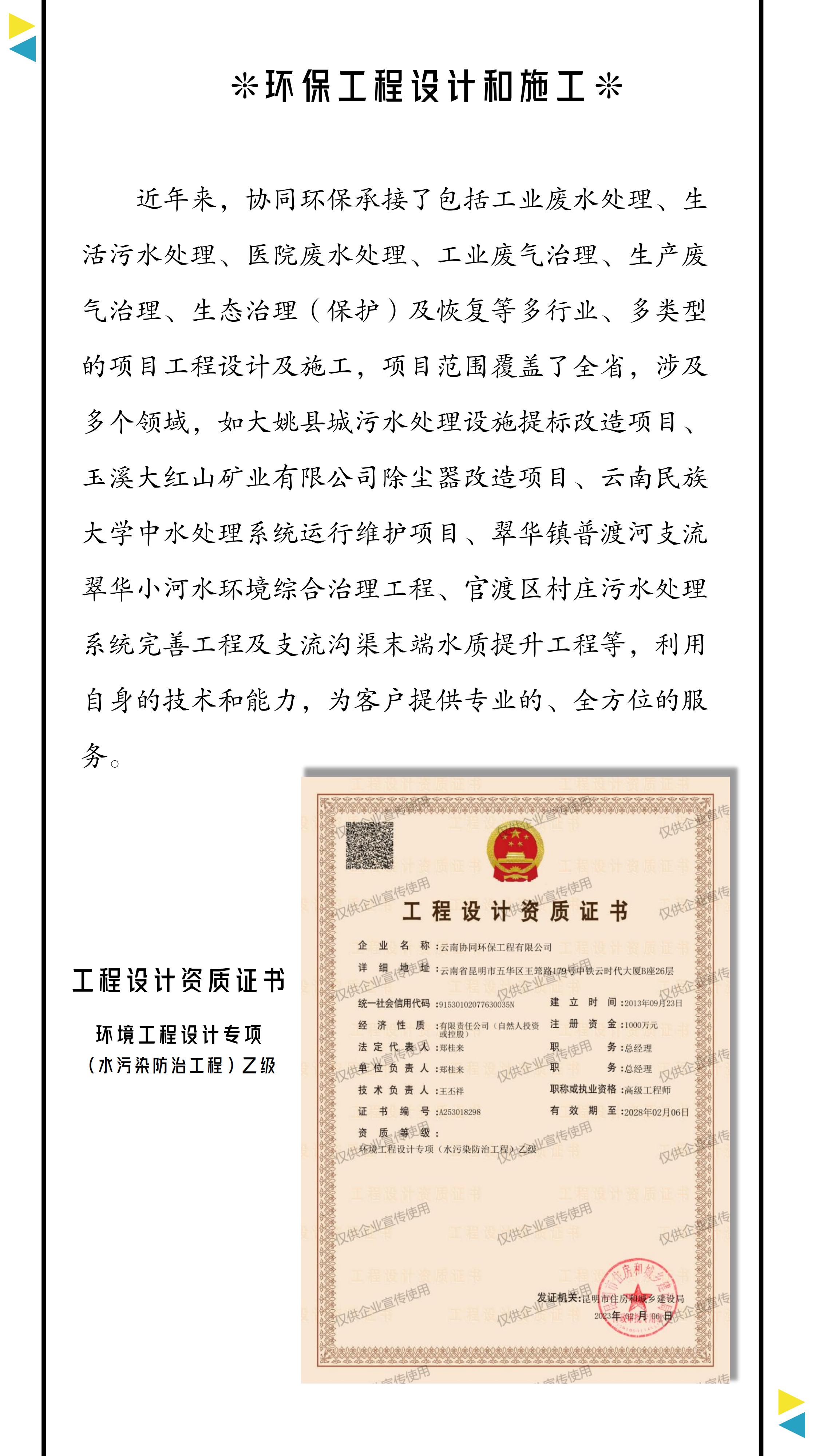 云南協(xié)同環(huán)保工程有限公司可承接工業(yè)廢水處理、生活污水處理、醫(yī)院廢水處理、工業(yè)廢氣治理、生產(chǎn)廢氣治理、生態(tài)環(huán)境綜合治理(保護(hù))等類型的工程。項目范圍覆蓋全省,涉及多個行業(yè),如大姚縣城污水處理設(shè)施提標(biāo)改造項目、玉溪大紅山礦業(yè)有限公司除塵器改造項目、云南民族大學(xué)中水處理系統(tǒng)運(yùn)行維護(hù)項目、翠華鎮(zhèn)普渡河支流翠華小河水環(huán)境綜合治理工程、官渡區(qū)村莊污水處理系統(tǒng)完善工程及支流溝渠末端水質(zhì)提升工程等。