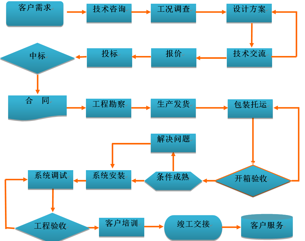 我公司經(jīng)過(guò)多年的經(jīng)驗(yàn)總結(jié),形成了一套完整合理的客戶(hù)服務(wù)流程體系,服務(wù)流程包括銷(xiāo)售服務(wù)、系統(tǒng)設(shè)計(jì)、采購(gòu)、生產(chǎn)、檢驗(yàn)、工程實(shí)施、投運(yùn)、維護(hù)等各個(gè)環(huán)節(jié)。公司對(duì)相關(guān)的服務(wù)流程持續(xù)的完善和優(yōu)化,使系統(tǒng)服務(wù)的質(zhì)量管理更加標(biāo)準(zhǔn)化、程序化、規(guī)范化,為系統(tǒng)服務(wù)工作奠定了扎實(shí)的基礎(chǔ)。